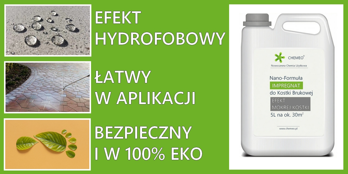 Silikonowy impregnat do kostki brukowej, nowoczesny produkt na bazie polimeru (silikonu) o doskonałych właściwościach, bezpieczny i nieszkodliwy, łatwy w użyciu. Doskonale chroni kostkę brukową przed czynnikami atmosferycznymi, brudem i mokroorganizmami (mech i porosty), wzmacnia strukturę betonu i wydłuża jego żywotność, tworzy „Efekt Mokrej Kostki”.
