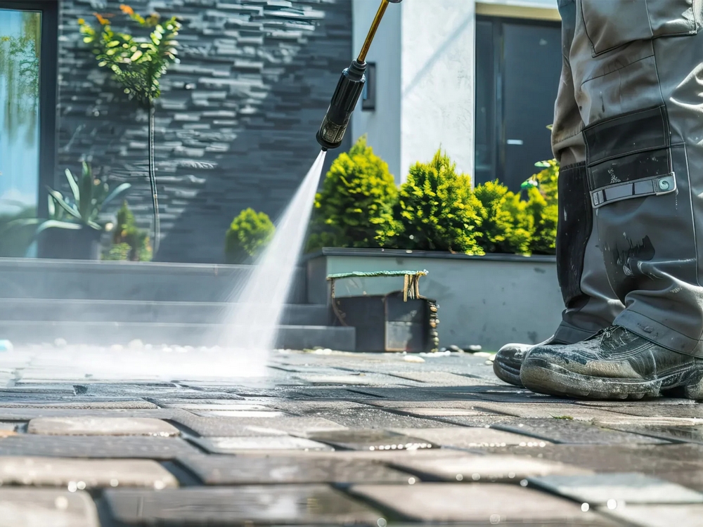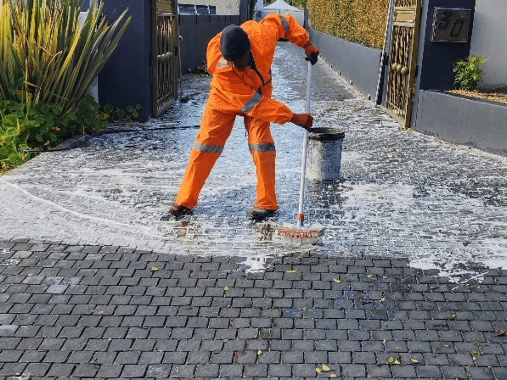 a. Wstępne oczyszczenie powierzchni z kurzu, piasku i brudu. Możemy to zrobić poprzez zamiecenie lub spłukanie powierzchni kostki brukowej wodą, tak by powierzchnia po tej czynności była wolna od luźnych zanieczyszczeń.